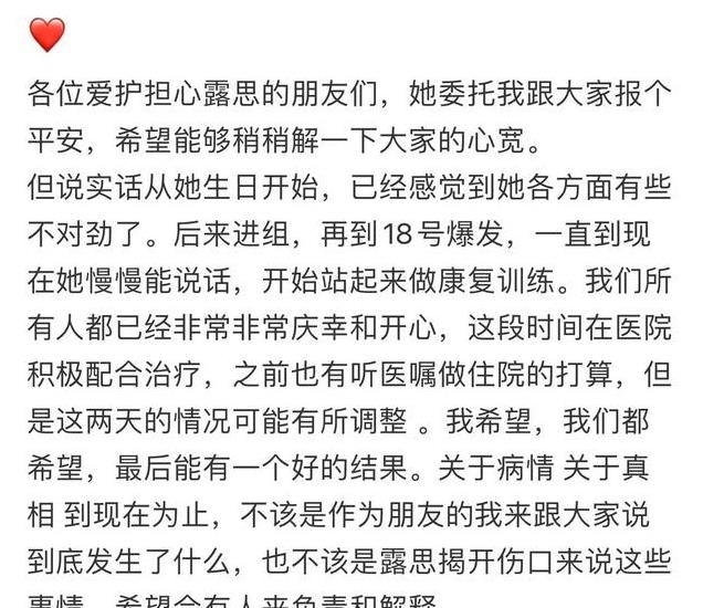 12月28日,赵露思委托好友魏笑公布了自己病情的最新情况,这两天粉丝和网友特别担心她,伴随着《恋人》停拍和网上各种病情严重的报道,大家的担心达到了顶峰,因为社交平台被关闭了,所以粉丝只能通过网络得到一些消息,看到照片中插管吸氧、毫无精气神的赵露思,粉丝心疼不已。