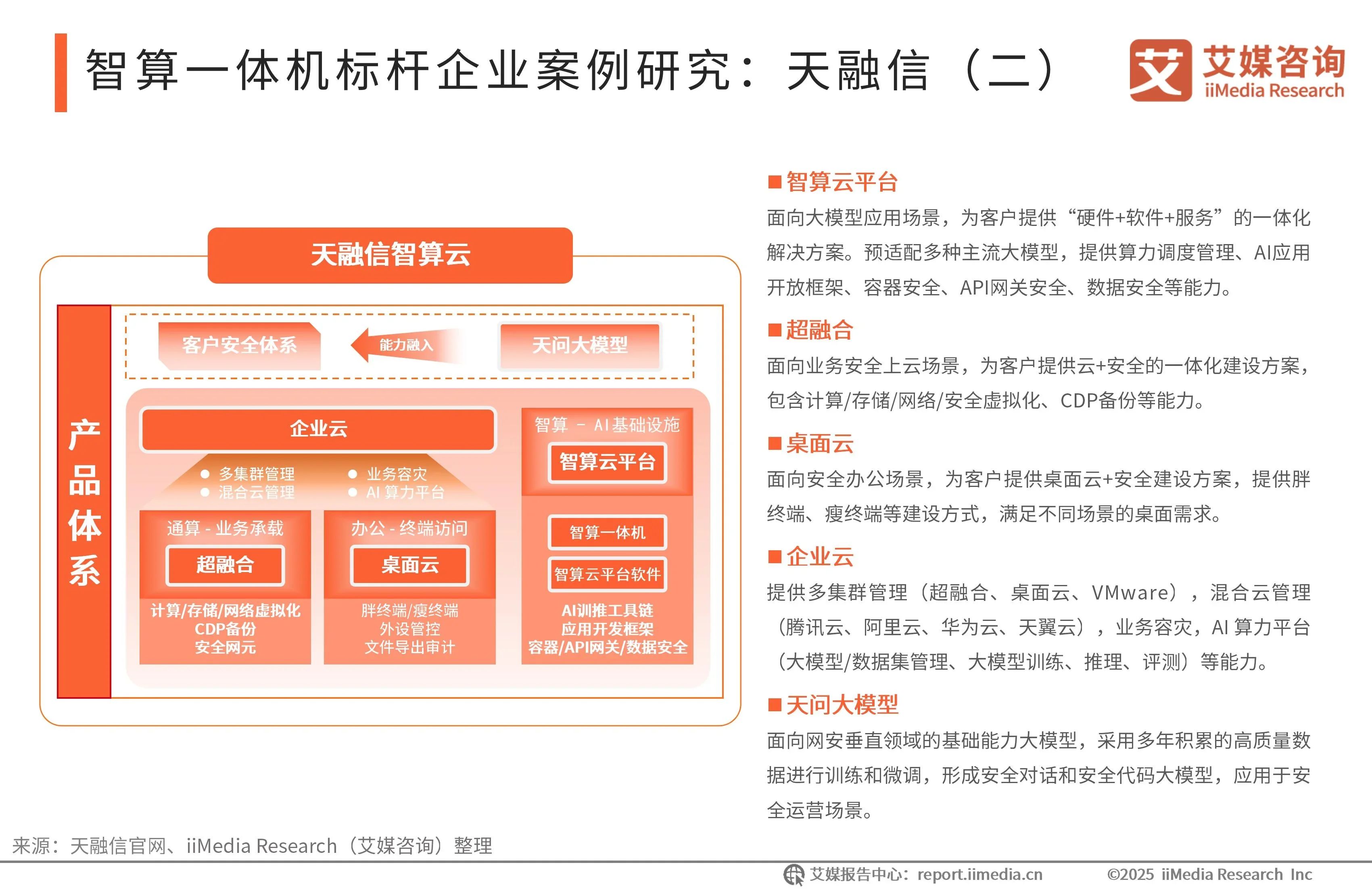 天融信智算一体机基于“AI 算力硬件+天融信智算云平台”,融合智算与安全能力,提供 AI基础设施与开发环境,助力企业快速、安全落地大模型应用。2025年2月,天融信智算一体机首批通过中国软件评测中心(工业和信息化部软件与集成电路促进中心)的大模型一体机能力验证;同年3月,天融信智算一体机入编产学研合作优秀创新成果集。在人工智能与数据安全双重变局下,智算一体机已从技术概念演变为企业数字化转型的“战略级基础设施”。