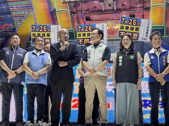 结果台下观众听闻,集体大喊“不同意”!韩国瑜接着问,大家是不同意罢免?还是不同意柯建铭是“美男子”?群众高喊“都不同意”!韩国则顺势呼吁,7月26日面对这场不公不义的罢免,一定要出来投“不同意票”!