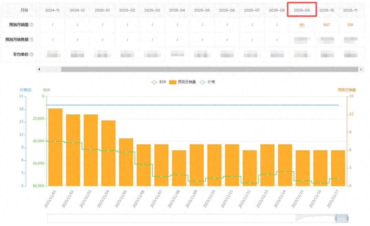 垂直类目选品法的好处非常多,其中一个好处是,对于产品会非常熟悉,看到某款产品无需其他数据就能判断出来产品是不是能做,竞争程度如何,需要花多少钱推广,选这款蓝海产品就是看某个小类目的新品榜单,款式比较小众,销量确实不高,上架没多久,用卖家精灵的销量预 测功能反查出来链接是9月份上架的,日销6-12单。