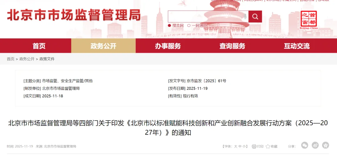 近日,北京市市场监督管理局等四部门印发《北京市以标准赋能科技创新和产业创新融合发展行动方案(2025—2027年)》。
