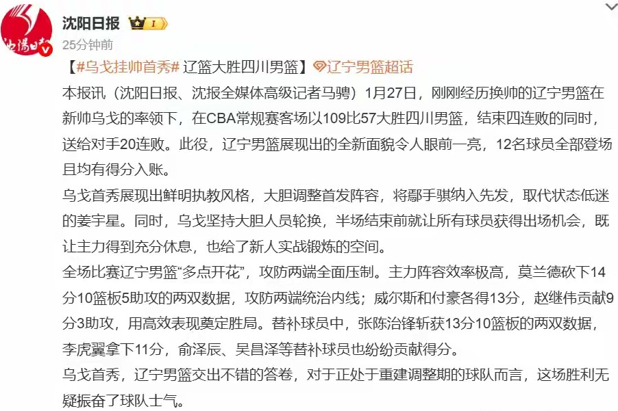 同时,《辽宁日报》也发文赞美乌戈是个好教练,带领辽宁男篮展现出了全新的面貌,令人眼前一亮,12名球员全部登场,且均有得分入账。
