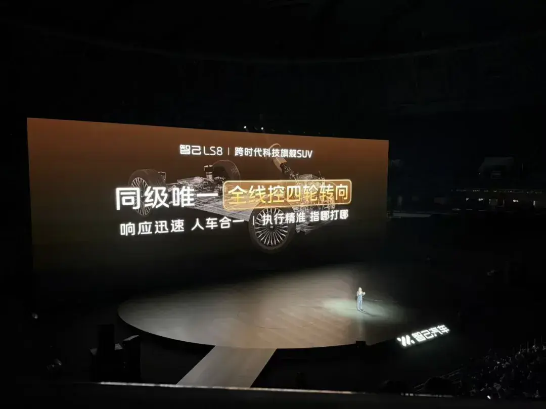 如果说设计决定了车的气质,那么性能则决定了车的灵魂。在30万级大型SUV市场,绝大多数产品仍在“够用”层面徘徊:动力够用就好,操控够稳就行,燃油经济性差不多就罢。但智己LS8选择了“不妥协”——它用三大跨时代硬核科技,将百万级驾控体验下放至30万区间,尤其是行业同级首发的全线控四轮转向系统,让这台车长超5米的旗舰SUV拥有了A0级小车的灵活身姿。双向24°智慧四轮转向加持下,智己LS8的转弯半径仅4.85米,比市面上许多两厢小车还要小,无论是魔鬼停车场的螺旋坡道,还是老城区的窄路掉头,都能一把从容通过,彻底终结“大车难开”的焦虑。高速行驶时,后轮与前轮同向偏转,车身稳定性如磐石,变道超车“指哪打哪”,真正实现了人车合一。这套系统以往只出现在百万级豪车上,如今智己将其全系标配,可谓诚意十足。