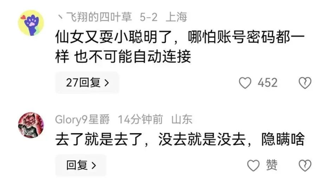 一位来自上海的网友在评论区留言称,小仙女又耍聪明了,哪怕是账号密码都一样,也不可能自动连接。
