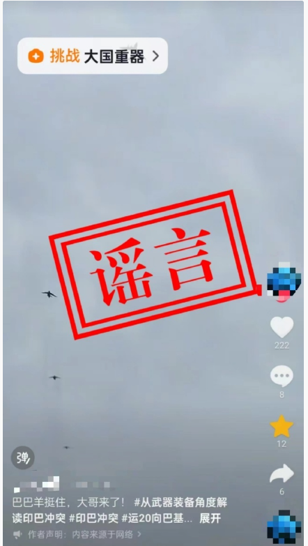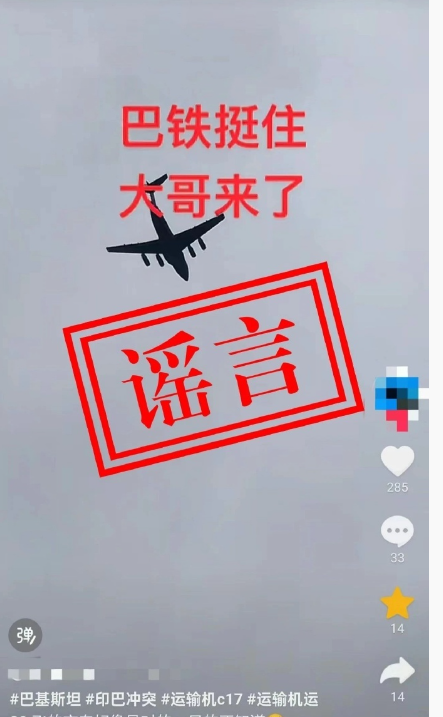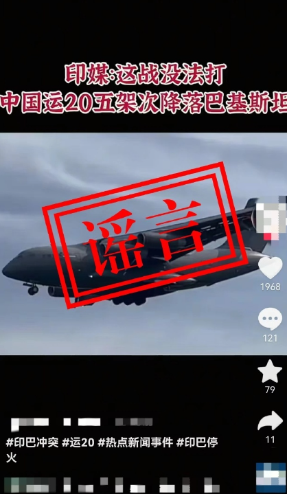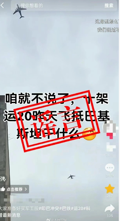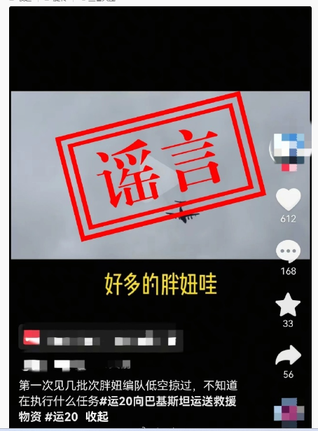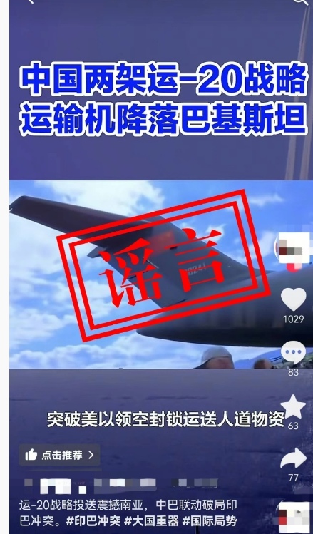 【官方严正声明:所谓"运-20向巴基斯坦运输物资"纯属谣言】近日,部分网络平台出现"中国人民解放军空军运-20运输机向巴基斯坦运送人道主义救援物资"的相关传言。针对此情况,中国人民解放军空军新闻发言人办公室于今日通过@人民空军 官方平台发布严正声明:经核查确认,相关图文视频信息均为虚假内容,系个别网民捏造传播的不实谣言。