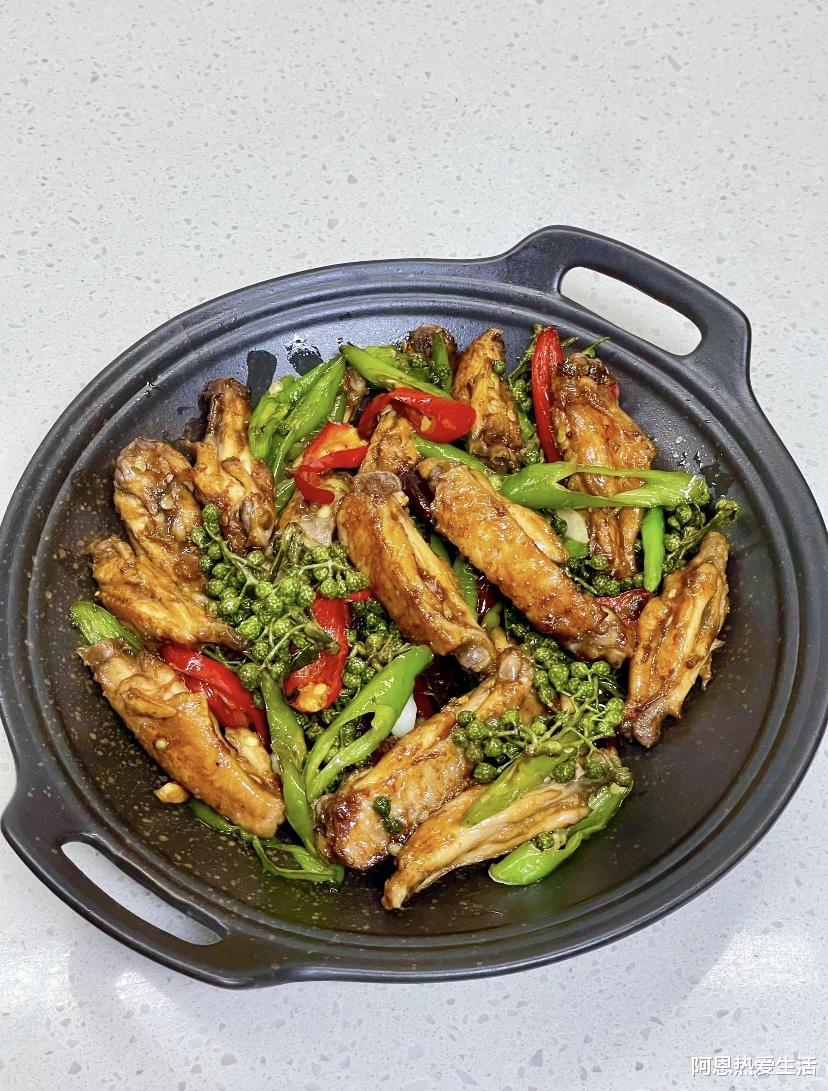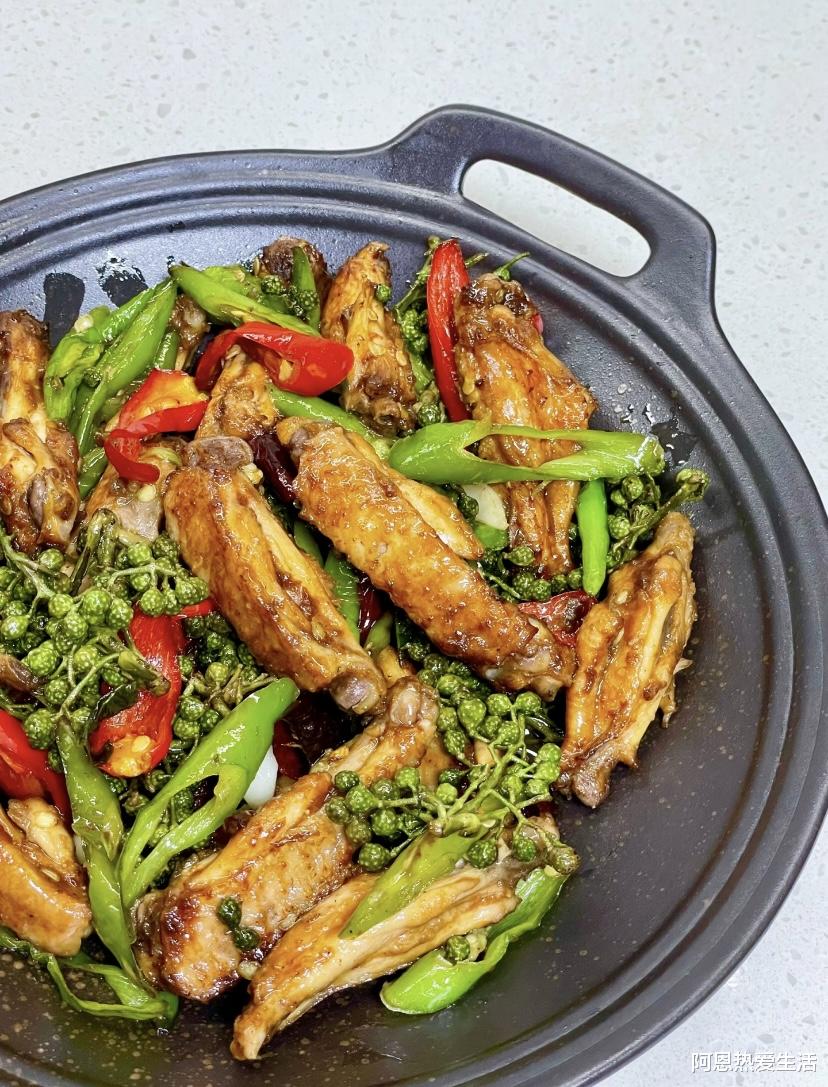 这道青花椒鸡翅,其实是从川渝地区的“花椒鸡”演变过来的。在重庆的铁山坪,有一道名菜就叫“花椒鸡”,讲究的是“一只鸡半斤花椒”,麻得人头皮发麻,但又欲罢不能。后来这道菜走进了千家万户,大家发现鸡翅比整只鸡更容易熟,也更好入味,于是就有了现在的青花椒鸡翅。
