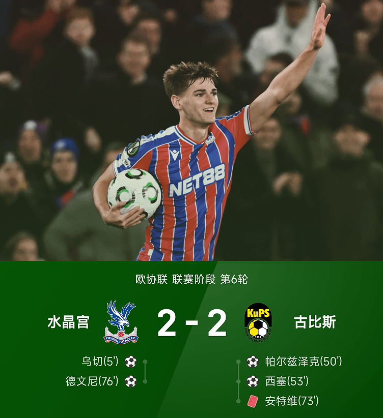 北京时间12月19日凌晨,欧协联联赛阶段第6轮爆出冷门。本场比赛在水晶宫主场塞尔赫斯特公园球场进行。