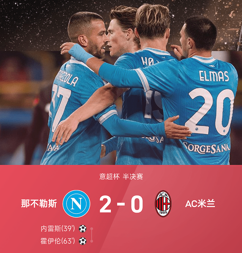意超杯:内雷斯、霍伊伦破门,那不勒斯2-0米兰晋级决赛
