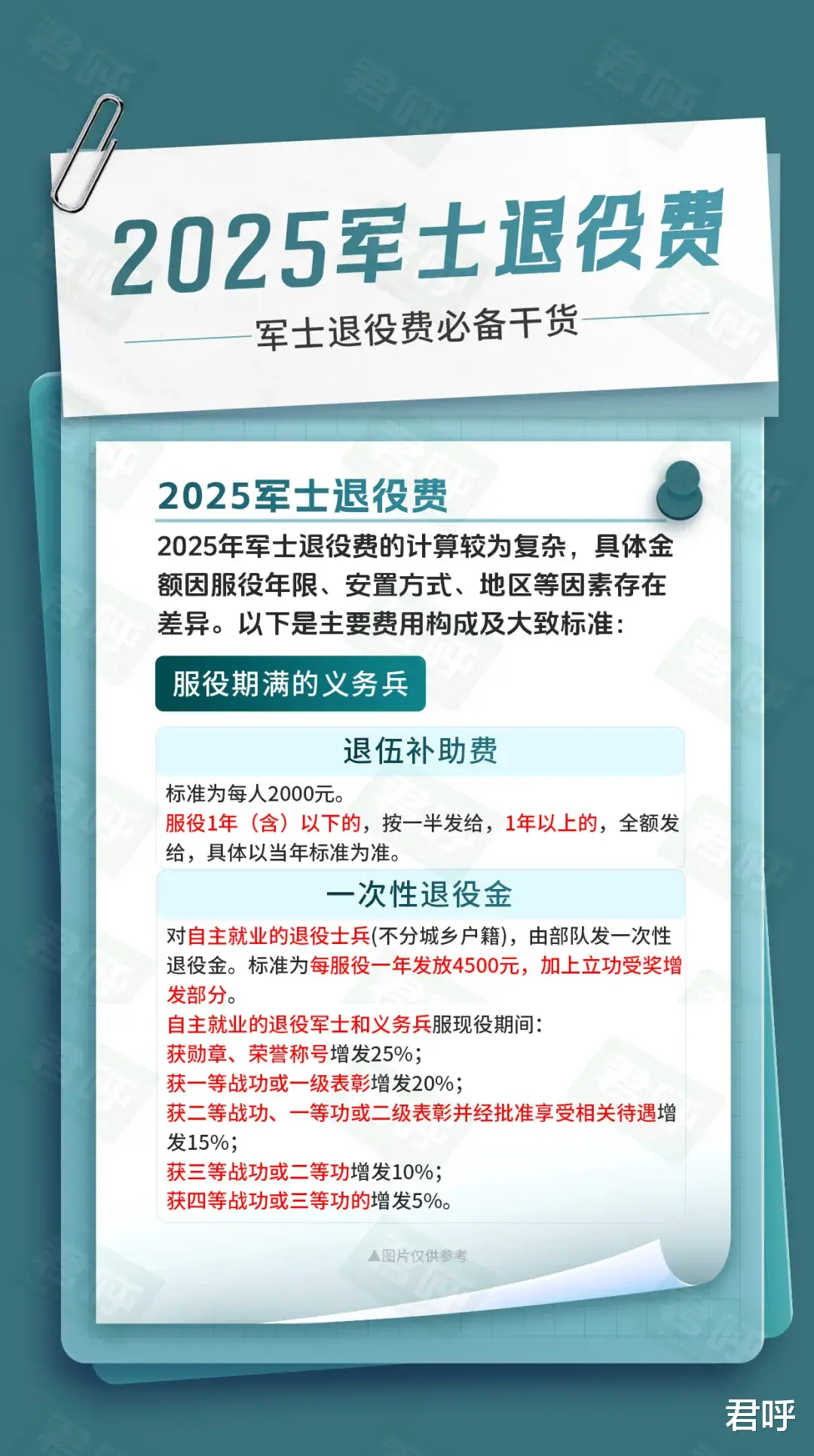 又是一年退伍季,即将脱下军装的你,是否正在关心退役费如何结算?别担心,这份干货满满的“2025年军士退役费详解”来啦!从复员费、安家补助费到住房资金,从一次性退役金到医疗保险转移,“君呼”帮你逐一梳理、清晰解读。立过功、受过奖?别忘了奖励工资和增发比例!回农村安置?还有回乡生产补助可申领!政策细节虽繁,地区标准或有差异,但请记住:你的奉献,国家铭记。这份退役费,是保障,是肯定,更是你奔赴新生活的坚实起点。“君呼”依据《退役军人保障法》《退役军人安置条例》及最新政策整理,助你退役之路清晰明朗——致敬每一位奉献青春的中国军人,愿荣光伴你开启新征程!【点击图片,更加清晰】