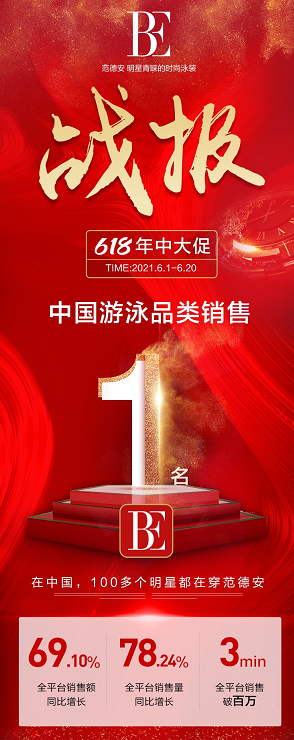一年一度的年中大促活动6.18狂欢已经画上句号了,时尚泳装界的领军品牌BE范德安再次一骑绝尘,以绝对优势拿下了6.18中国游泳品类销量冠军,连续多年蝉联6.18销冠。