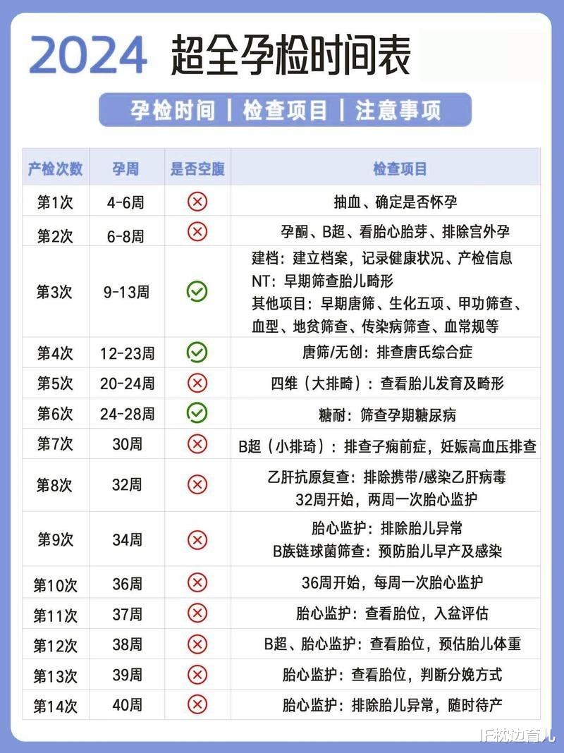 整个孕期至少进行11-16次产检,包括体温、体重、脉搏、血压、宫高等体格方面,尿常规、血常规等化验方面,以及胎心监测、骨盆测量、彩超、内诊等辅助检查。