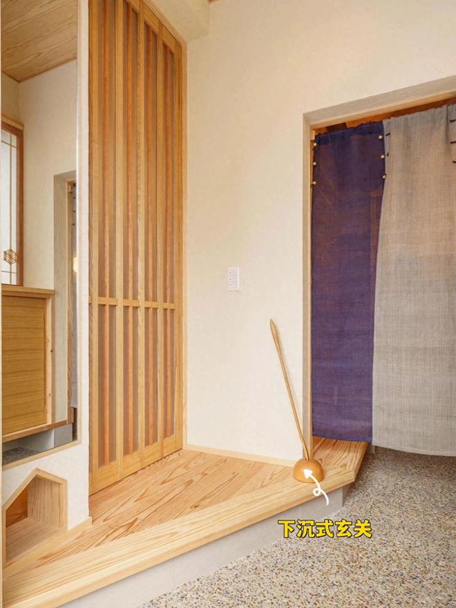 下沉式玄关是日式装修中比较常见的设计,也被称之为落尘区,它利用玄关和屋内的地面高度差,避免人们将室外灰尘带入屋内。