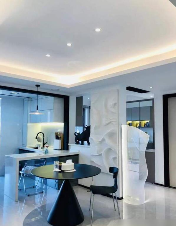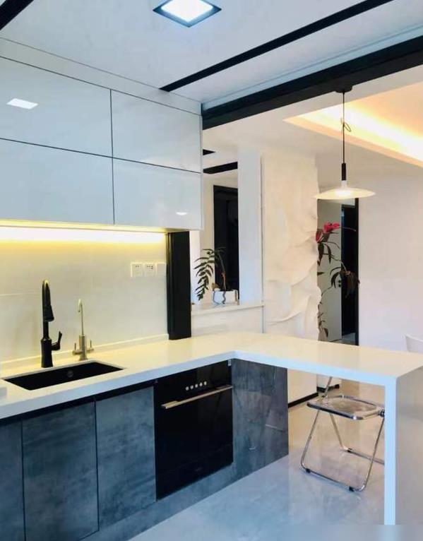餐厅和厨房之间 的墙体被打通,取而代之的是一个实用的吧台设计,这样的设计不仅方便了居住者在厨房和餐厅之间的流通,还增加了就餐的体验感。