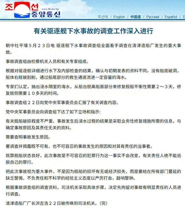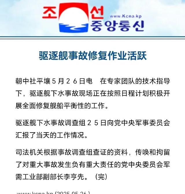 距离2025年5月21日朝鲜人民军海军“崔贤”级驱逐舰二号舰,在朝鲜东海岸的清津造船厂陆地船台下水时侧翻,已经过去了接近一周时间。记得5月23日朝中社曾报道,说5月22日劳动党中央派出专家组抵达清津造船厂后,曾经给出了一个总体性的处理意见,并向劳动党中央进行了汇报。