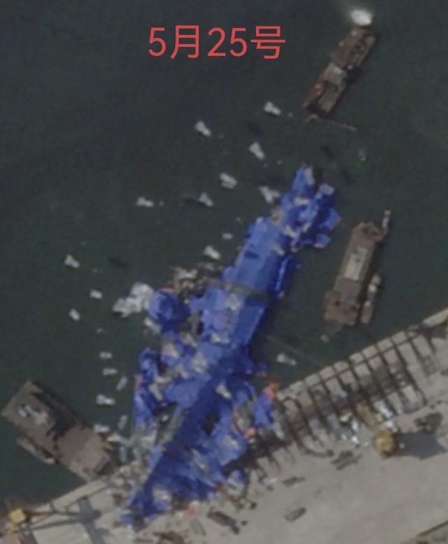 到5月25日,西方商业侦察卫星公司公布了一批新的卫星照片。从这些卫星照片里可以看到,出现在“崔贤”级旁边的工作船已经增加到3艘,其中一艘应该是机动式码头,还有两艘应当是驳船和大马力拖船。