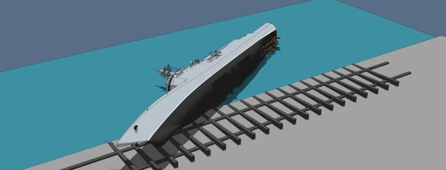 要是它全都在岸上,或者全都在水里,反而好办了。实在不行,咱大力出奇迹,连接钢索之后用大马力拖船强行拖曳,那都能给它扶正了。结果现在一半在岸上,一半在水里,你扶正都没法扶正,还得先把这艘舰给拖到水里再说。