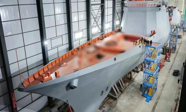 不过,舰体上覆盖的大量蓝色塑料薄膜没有去除。诡异的是,造船厂的下水滑道上,甚至覆盖了更多的蓝色塑料布,把下水滑道的前部覆盖得甚至比舰体还要严实。不由得让人怀疑,这下水滑道上,有什么见不得人的东西或者故障?