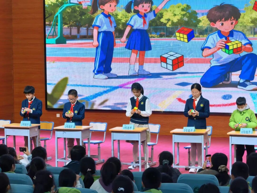 作为压轴大戏的“校园吉尼斯挑战赛”现场气氛紧张热烈,各路高手同台竞技,上演了一场速度与智慧的巅峰对决。数独赛场的静心沉思、速算二十四点的铃声急促、圆周率记忆的滔滔不绝、以及魔方、华容道、速叠杯令人眼花缭乱的指尖竞速,无不引爆全场。这不仅是一场数学竞赛,更是一次专注力、记忆力与逻辑思维的综合较量,多项校园纪录被一一刷新。