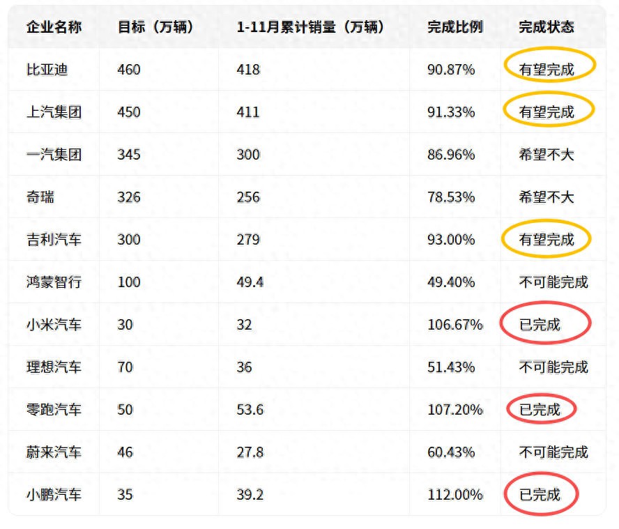 而像比亚迪、上汽、吉利则完成率超过90%,有望完成。至于有一些车企,则希望不大了,甚至有一些低于70%的,不可能完成了。