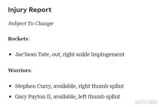 据火箭队的跟队记者本·杜波斯报道,火箭队方面,他们的锋线球员杰肖恩·泰特依旧因为脚踝扭伤缺阵。从本赛季常规赛结束后,泰特就一直没有出战过季后赛。其实在常规赛里,泰特是火箭队重要的轮换球员,但是在季后赛里,他非常不巧一直有伤在身。