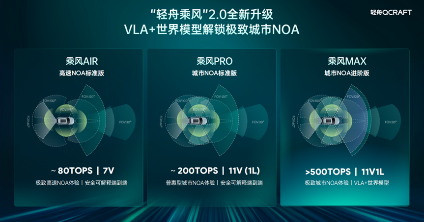 乘风AIR:基于安全可解释端到端技术打造,提供极致高速NOA体验,约80TOPS算力,采用7V传感器配置;