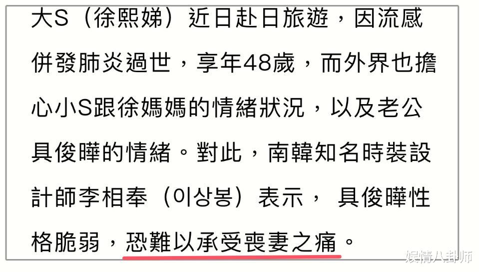 在这个悲痛的时刻,我们除了对大S的离世感到惋惜和悲痛之外,也应该更加关注具俊晔的状态。他作为大S最亲密的人,此刻的痛苦和崩溃是难以想象的。我们应该给予他更多的理解和支持,让他能够度过这个艰难的时期。