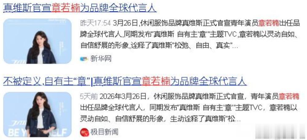 3月26日,休闲服饰品牌真维斯正式官宣章若楠出任全球代言人,同期发布“自有主‘章’”主题TVC。