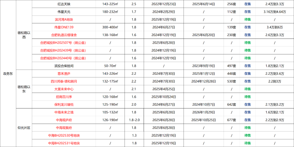 政务东现在大概可以分为三个片区,宿松路以西有现房销售、准现房的红达天映、伟星天元、70年产权供应合柴拾间,以及云缦璞舍(尾盘)和伟星ONE139在售,待售楼盘就是前面介绍的滨河湾A地块、城投姚公庙3块地。