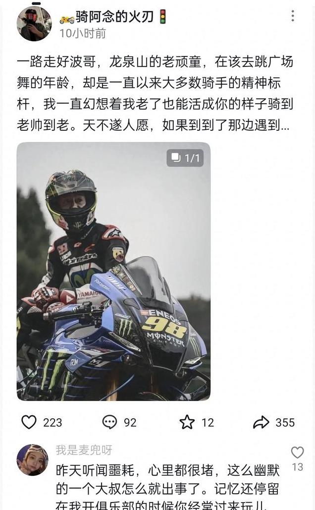 在很多与李波有交集的机车爱好者眼里,他是一个很平和且幽默的人,对于他突然离去感到无比惋惜。