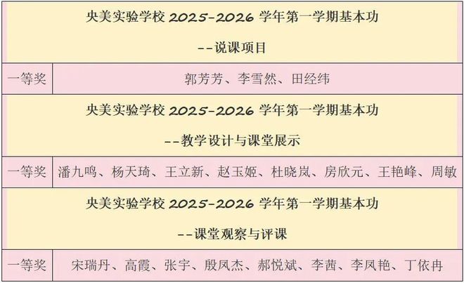会议对在本次基本功活动中表现突出、成绩优异的教师进行了表彰与颁奖。本次基本功汇报活动中,获得教学设计与课堂展示项目一等奖8人,二等奖12人,获得课堂观察与评课项目一等奖8人,二等奖11人,获得说课项目一等奖3人,二等奖4人。同时,理综组、地理组和数学组获得了优秀组织奖。高中校区主管校长易瑾、央美实验学校副校长李锐为获奖老师颁发荣誉证书。获得校级一等奖的老师参加了集团校的基本功比赛,并取得了优异的成绩。