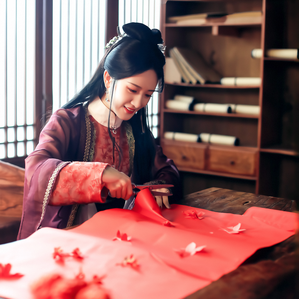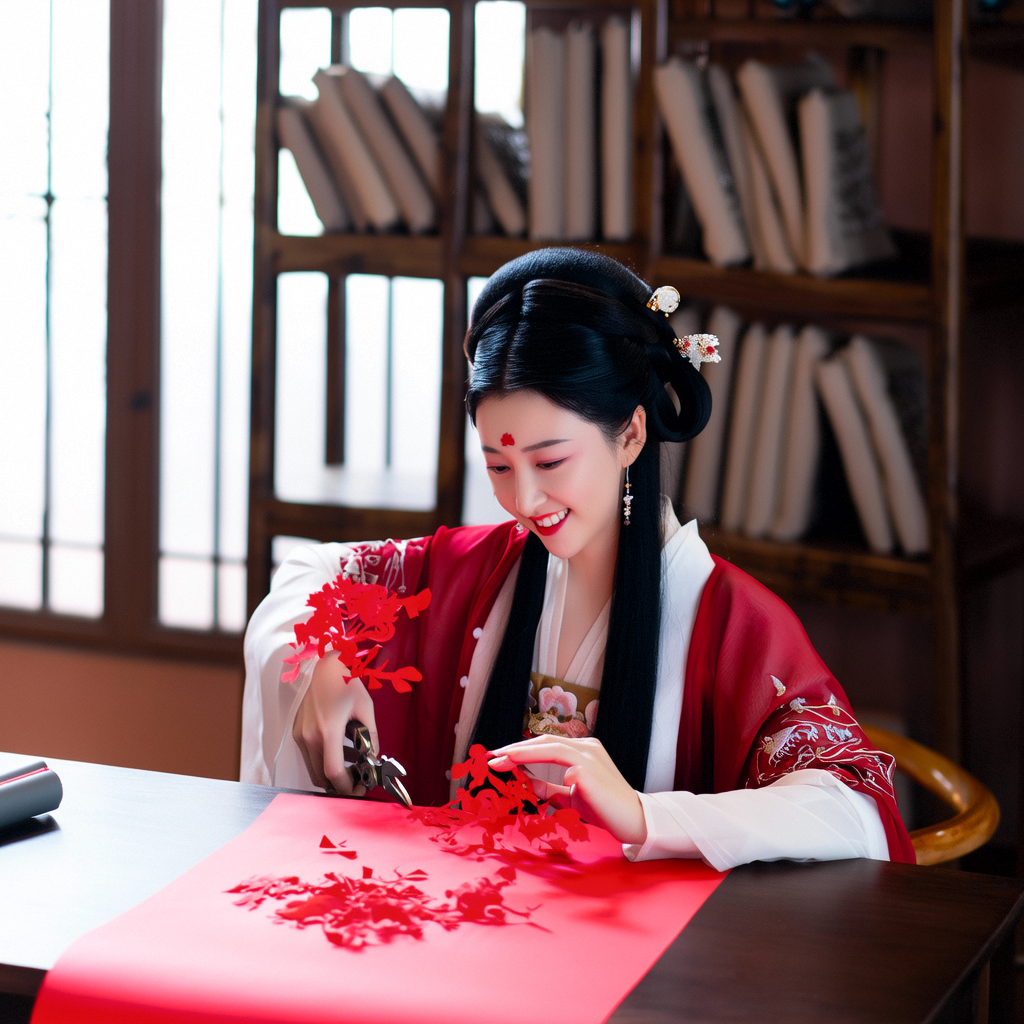 她们眉眼间满是沉醉与专注,唇角微微上扬,似在与手中的纸张、剪刀进行着无声的对话。阳光透过窗棂,洒在她们身上,为这专注的剪纸场景增添了一层柔和的光晕。