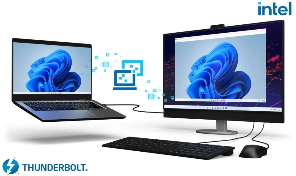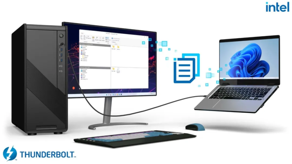 Thunderbolt™ Share的核心价值在于“简单、快速、高效”。用户只需用一根经过Thunderbolt™ Share认证的Intel®Thunderbolt™ 4线缆或其他扩展设备连接两台PC,连接过程便会快速自动完成,并实现跨设备操控、文件快传和数据高速迁移等功能。
