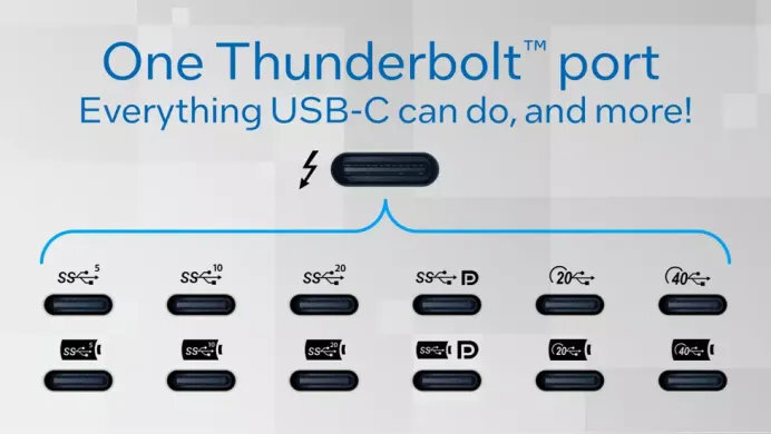 如果用户的外置存储设备传输协议并没有达到Intel®Thunderbolt™ 4的水平,Intel®Thunderbolt™ 4强大的向下兼容能力也可以让这些外置设备发挥出其理论的最大性能。Intel®Thunderbolt™ 4可以完美兼容Intel®Thunderbolt™3、USB4和USB3系列的传输协议,实现“一口走天下”。