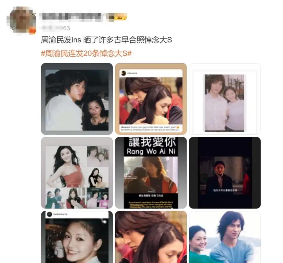 在大S去世后,网上一度传言周渝民发了20条动态悼念,但很快就被经纪人辟谣。