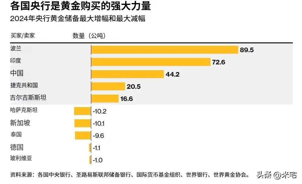 波兰2024年购买黄金89.5吨,整个黄金在外汇储备的占比接近20%,而波兰在2025年继续增持黄金,并计划进一步提高黄金在整个外汇储备占比。