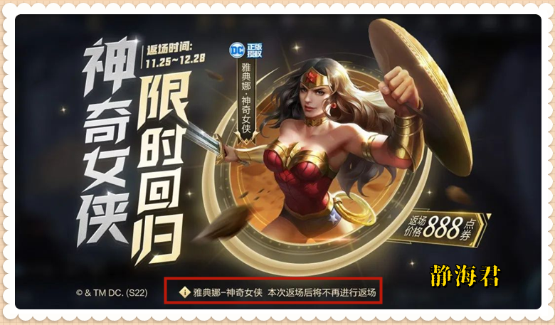 首先,策划在神奇女侠的返场公告里明确标注了该皮肤后续不会再进行返场(常规皮肤都是写的不会再以直售的形式返场)。