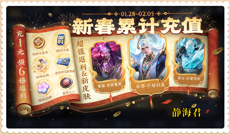 千劫归真怎么获取呢?途径目前只有一个,在特定的时间段(春节版本中的特定时间,1月28日~2月5日),累计充值达19888点券,即可领取后羿的千劫归真皮肤。