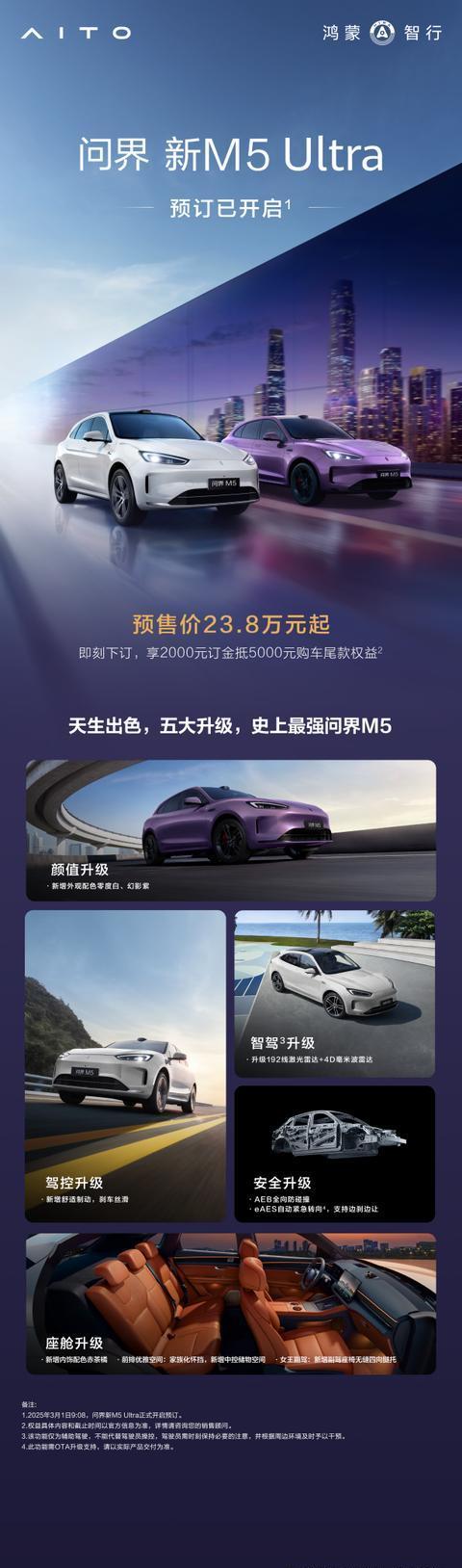 最后,我想说的是,汽车不仅仅是一种交通工具,更是一种生活方式。选择一款适合自己的汽车,就是选择一种适合自己的生活方式。而问界新M5 Ultra,正是这样一款能够为你的生活增添色彩的汽车。