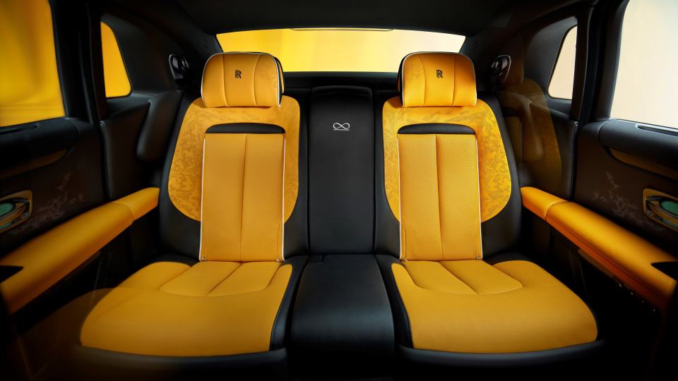 如定制方案包含带固定中央扶手的沉浸式座椅,客户可在后排科技纤维瀑布饰板处呈现Black Badge系列标志性的“无限”标识。这一饰板位于靠背可调的后排座椅中央,并于其中藏有香槟冷柜。瀑布饰板被覆以色泽具有微妙区别的六层漆面,而以航天级铝材精心打造的“无限”标识则被置于第三层和第四层漆面之间,从而营造出标识悬浮于科技纤维饰面之上的视觉效果。