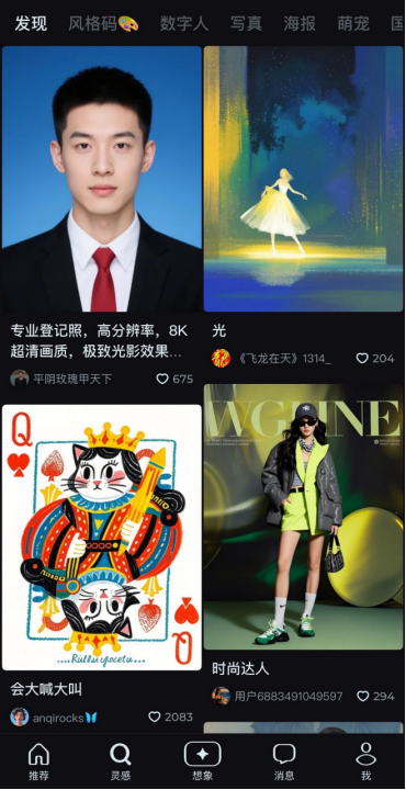 如今打开即梦,不论是PC网页,还是手机APP,首先进入的都是发现页,且有数字人、写真、海报、萌宠等多个分区。页面排布类似小红书,有若干内容卡片,显示图片/视频预览、标题以及发布内容的账号名。点击进入帖子,用户可以做同款,也可以直接点赞和评论。