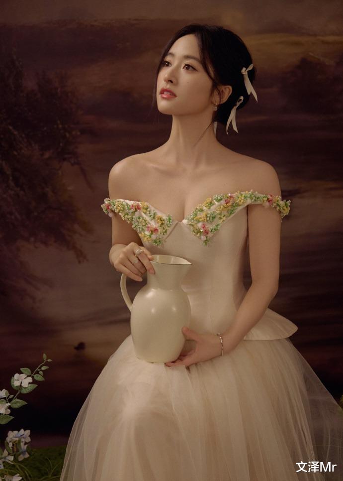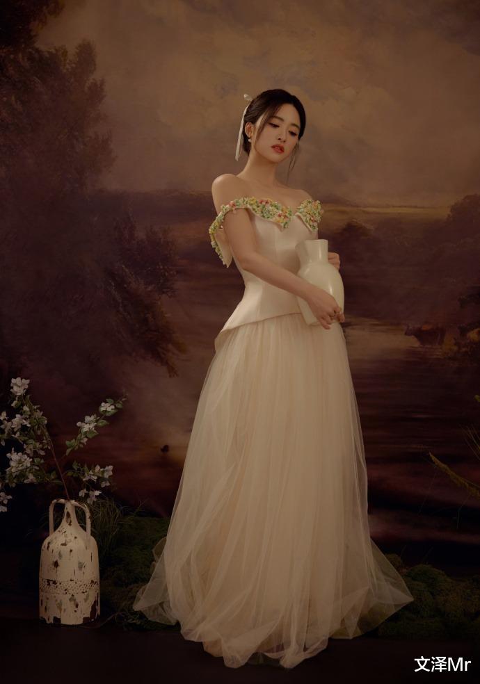 沈月身着一袭白色露肩纱裙,肩部点缀着色彩鲜艳的花朵图案,如同从古典油画中走出的少女。她手持白色陶罐,姿态优雅从容,黑发盘起,发间别着精致的发饰,在深色调的背景衬托下,整个人散发着温婉而神秘的气息。