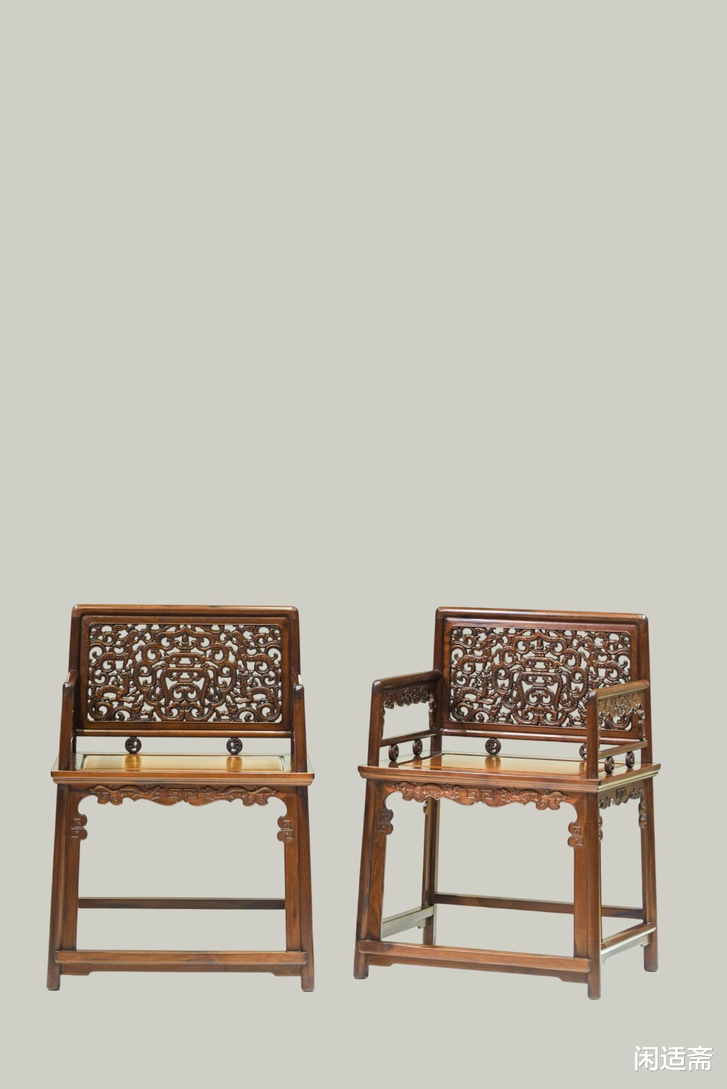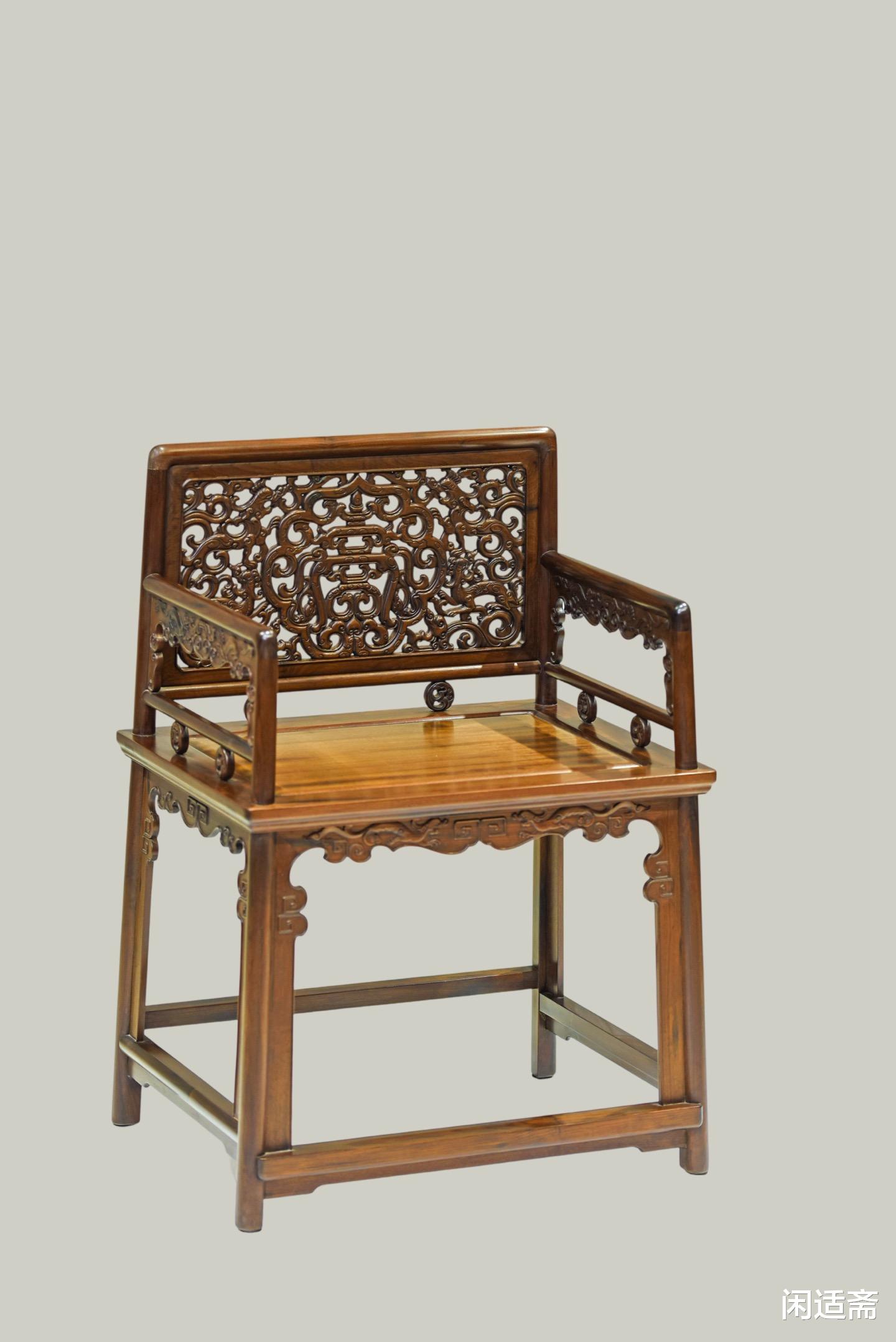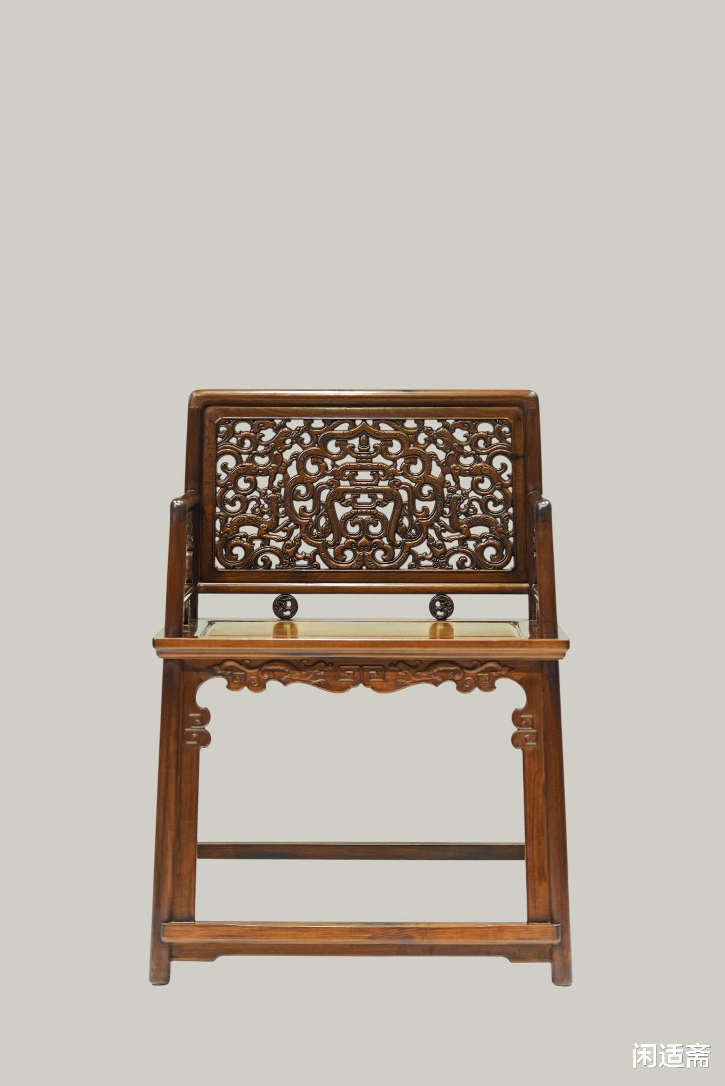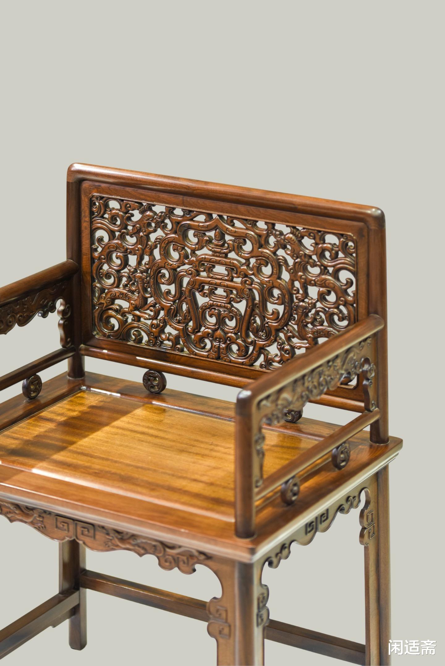 椅身通体融入螭龙捧寿纹饰,螭龙造型灵动矫健,有着奋力向上的升腾之势,象征着积极进取、前程似锦;捧寿纹样寓意情深寿长、福寿安康,承载着人们对美好生活的期许与祝福。扶手与座下牙板均有螭龙托举纹饰,象征前途顺畅、大业有成,寄托着对事业顺遂、步步高升的美好祝愿。