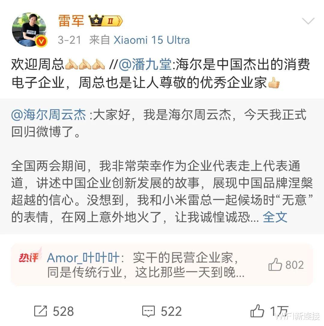 海尔释放的信号,小米应该是接受到了。当周云杰发布微博,宣布“回归”冲上热搜之后,雷军就进行了转发祝贺。