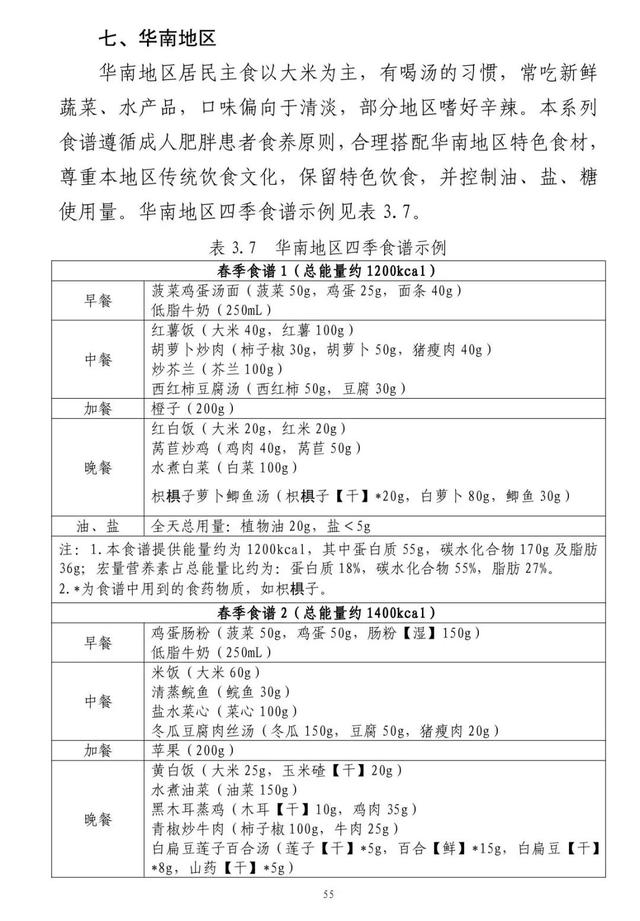 值得注意的是,这份食谱细化到了全国不同地区的食谱示例,并备注了食谱的“总能量”。