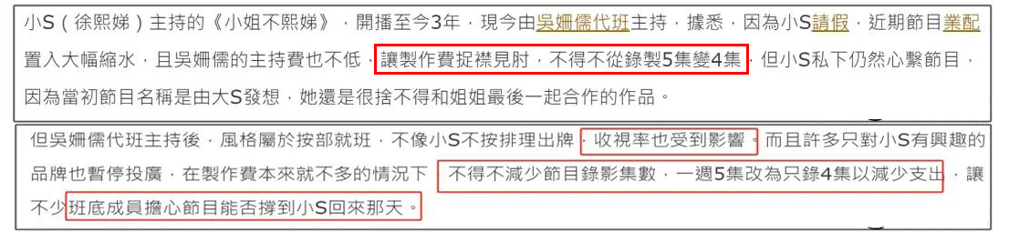 据此前节目组透露,广告商撤资明显,砍掉了很多广告,另外前来代班的吴宗宪女儿吴姗儒主持费用也不便宜,因此让节目制作费捉襟见肘,最后不得不在节目内容上做文章,把原来一周5集缩减至4集。