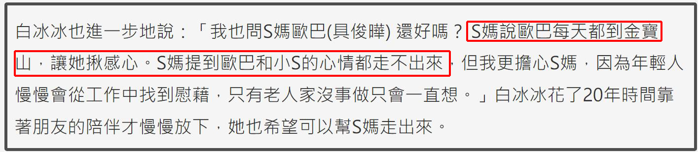 看来,S妈好友白冰冰之前的判断是正确的,她称小S、具俊晔等年轻人可以慢慢从工作中找到慰藉,走出悲伤。但白冰冰坦言更担心S妈,因为只有老人家没事只会一直想,这一点白冰冰也是深有体会。