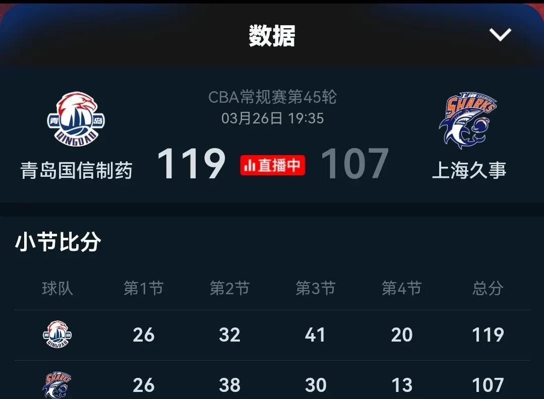 青岛队以119:107战胜上海队,豪取五连胜!六人得分上双,表现出色。这场胜利让青岛队以30胜15负,75分的积分反超广东队,暂列积分榜第六。而上海队,则在比赛中遭遇挫折,核心球员洛夫顿更是因为犯满离场,最终遗憾告负。这对于上海队来说,无疑是一个巨大的打击。