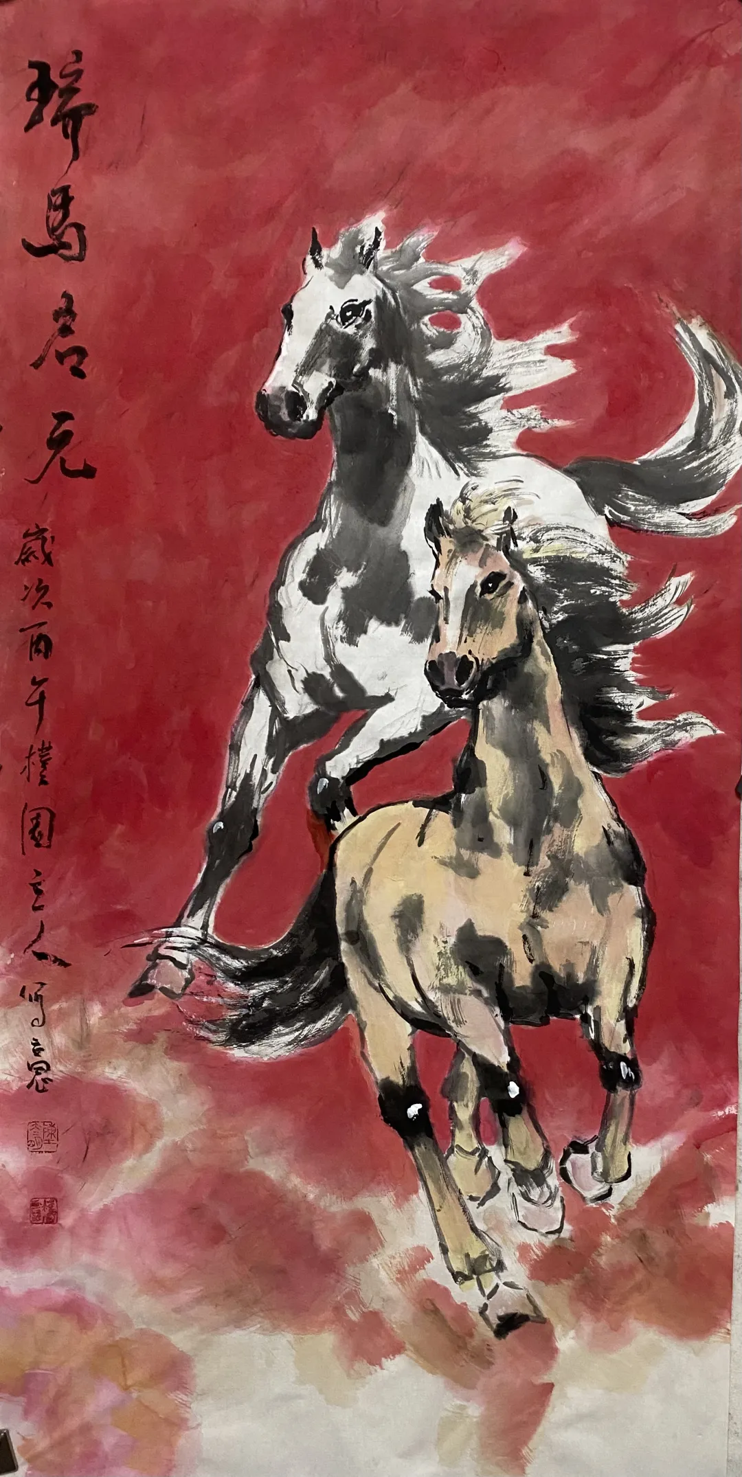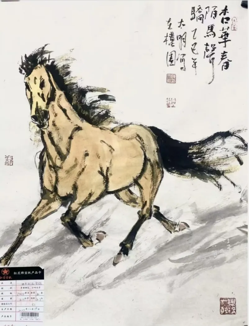 在墨法与设色上,陈太明打破了传统水墨的单一色调限制,将墨色与色彩有机融合。他既保留了水墨的写意本质,用焦、浓、重、淡、清的墨色层次塑造马的质感,又大胆运用朱砂、花青、藤黄等单色为骏马赋彩,如红马的热烈、白马的素雅、紫马的沉稳,色彩与墨色相互映衬,既丰富了视觉效果,又未失写意的空灵。这种“墨色相融”的手法,让其笔下的骏马既有传统水墨的韵味,又契合了现代观众的审美视觉需求。陈太明画马的造型并非是对自然物象的刻板摹写,而是经过艺术提炼后的意象塑造。他深入观察马的生理结构与动态规律,却不拘泥于解剖细节,而是抓住马奔、立、饮、嘶等姿态的核心特征,进行夸张与简化。如低头饮水的骏马,躯干的曲线被适度拉长,头部的低垂姿态更显悠然;奔跃的群马,四肢动态被强化,马首的昂起、鬃尾的飞扬共同营造出“天马行空”的气势。这种造型方式,既符合中国传统“以形写神”的审美准则,又让马的形象脱离了自然形态的束缚,成为承载情感与精神的艺术符号。