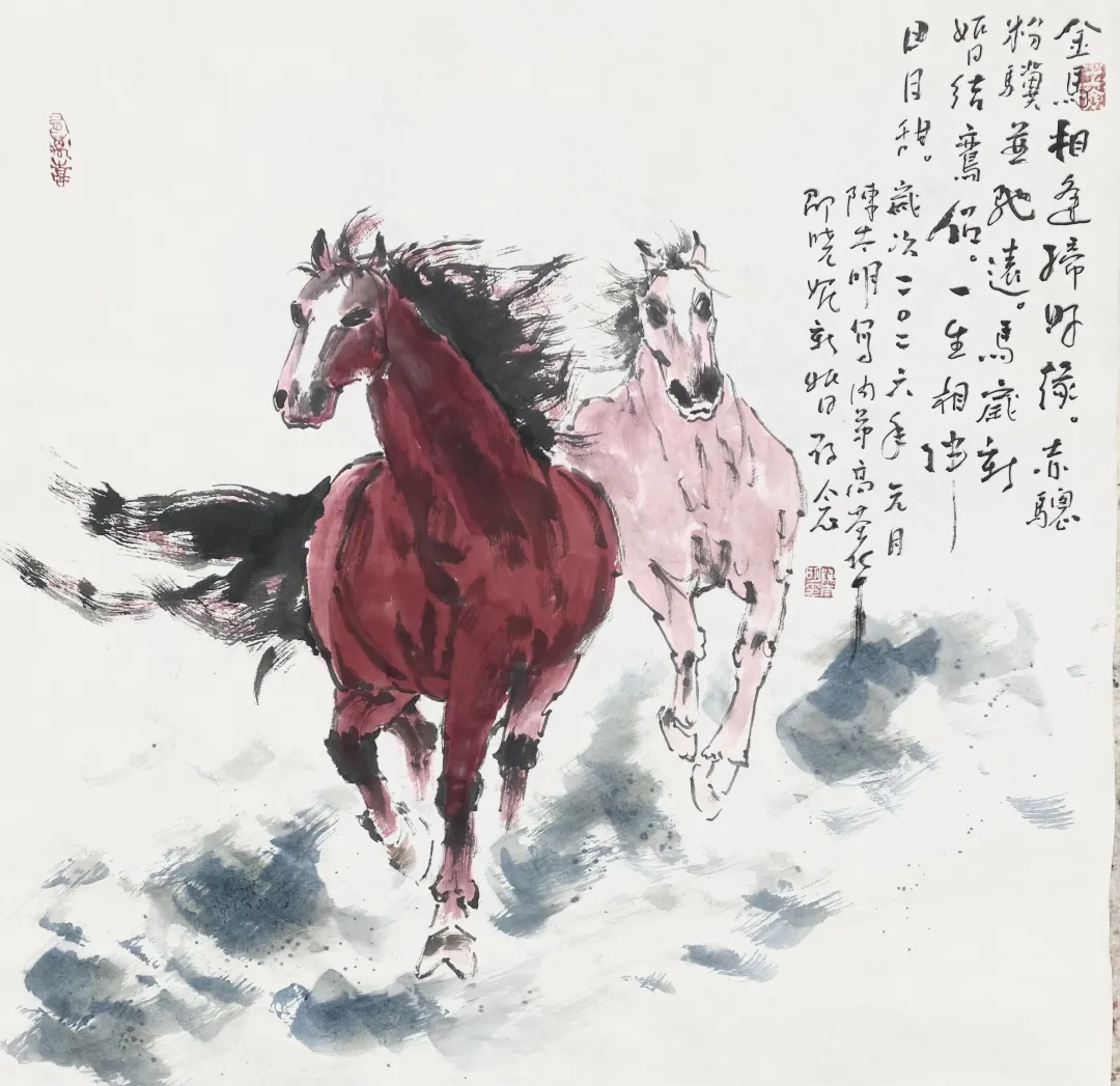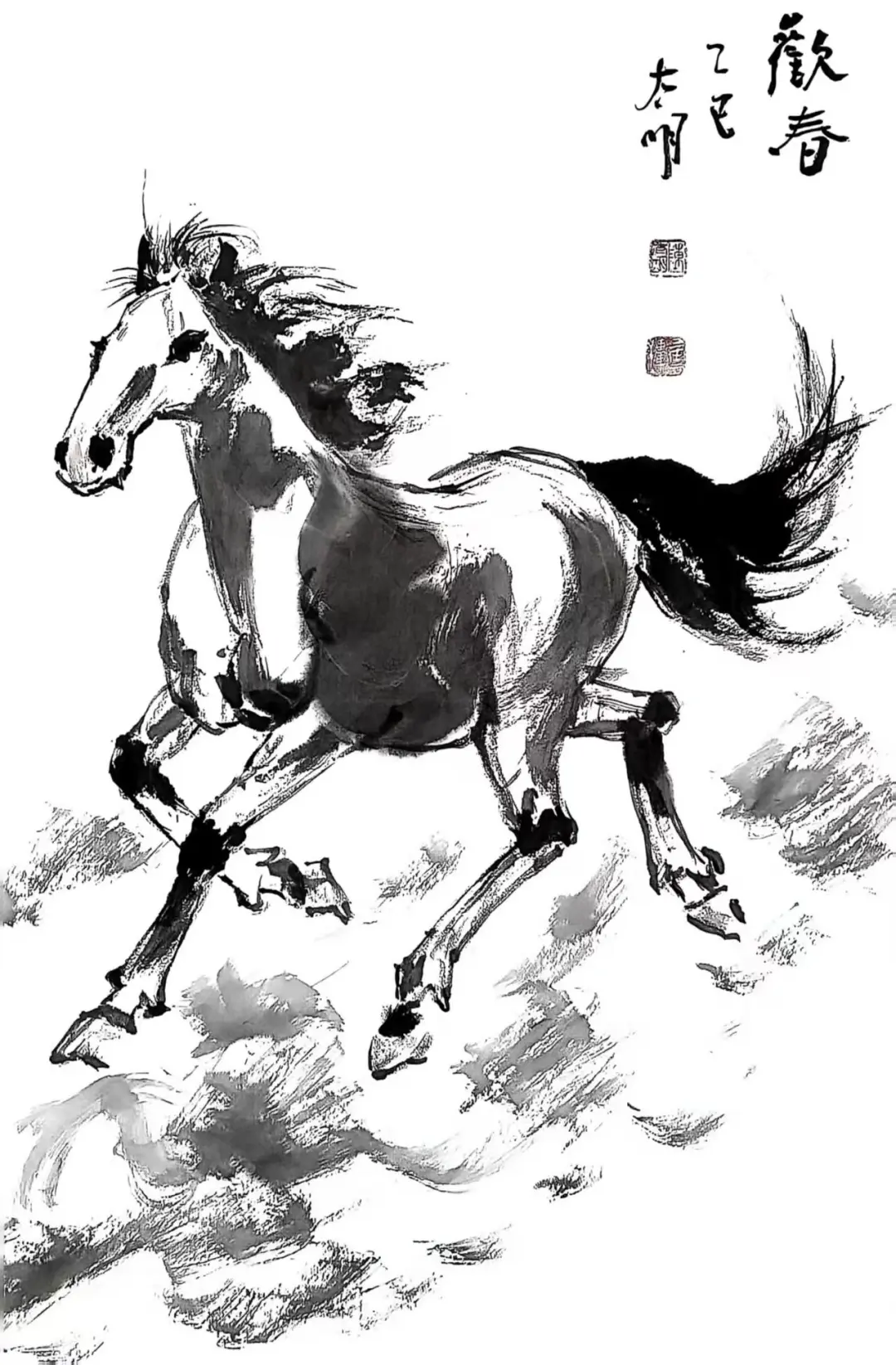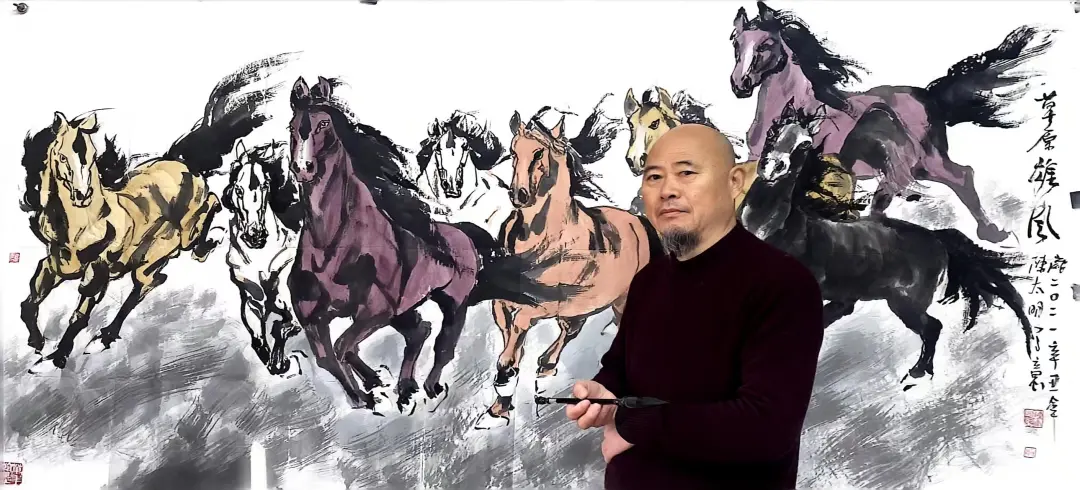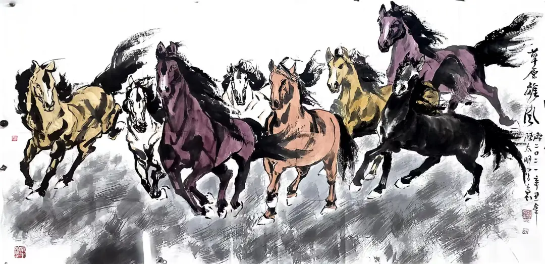 陈太明的画马作品立足中国传统写意画笔墨精神,融合现代审美意趣,以奔放的笔墨、灵动的造型和雄浑的意境,塑造出兼具精神气度与时代风骨的骏马形象。其创作既传承了徐悲鸿等前辈画马的艺术精髓,又形成了独树一帜的个人风格,通过对马的形态、神韵与精神的挖掘,寄予了对生命力量、民族精神的赞颂。