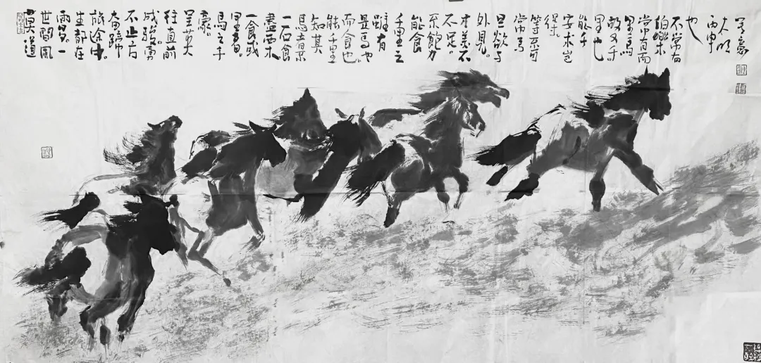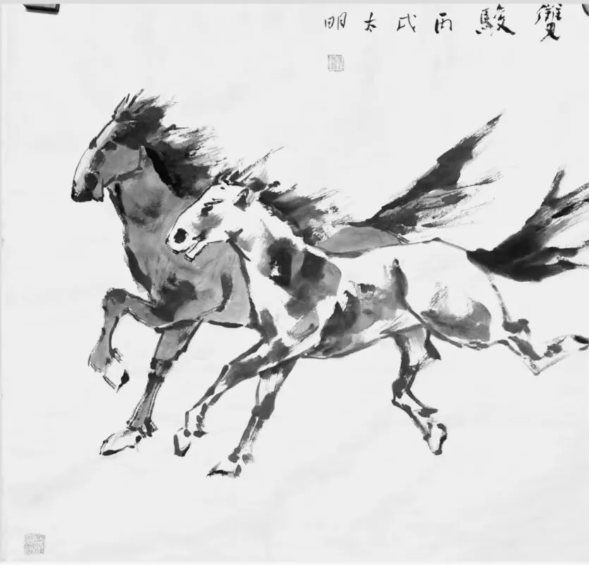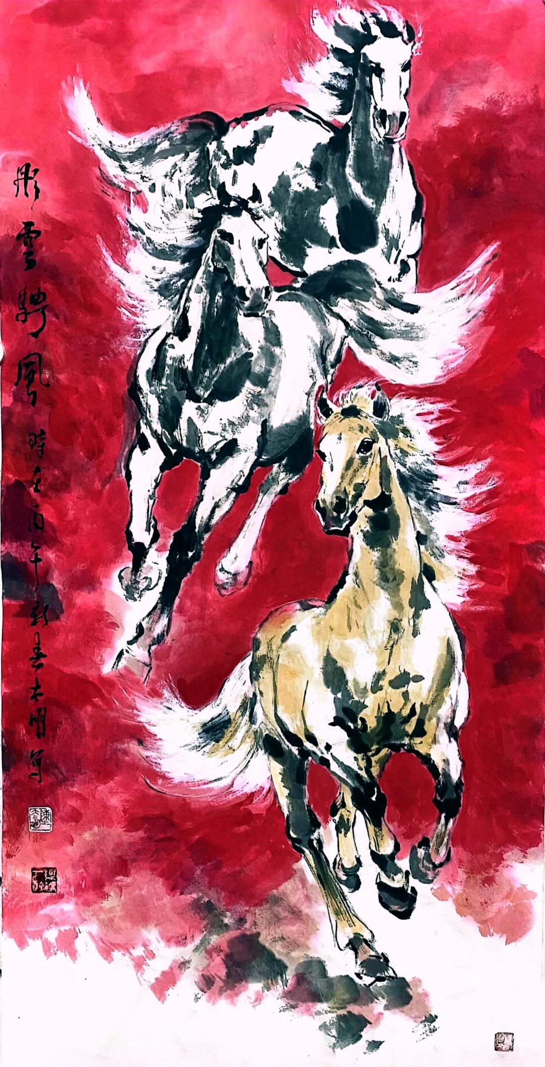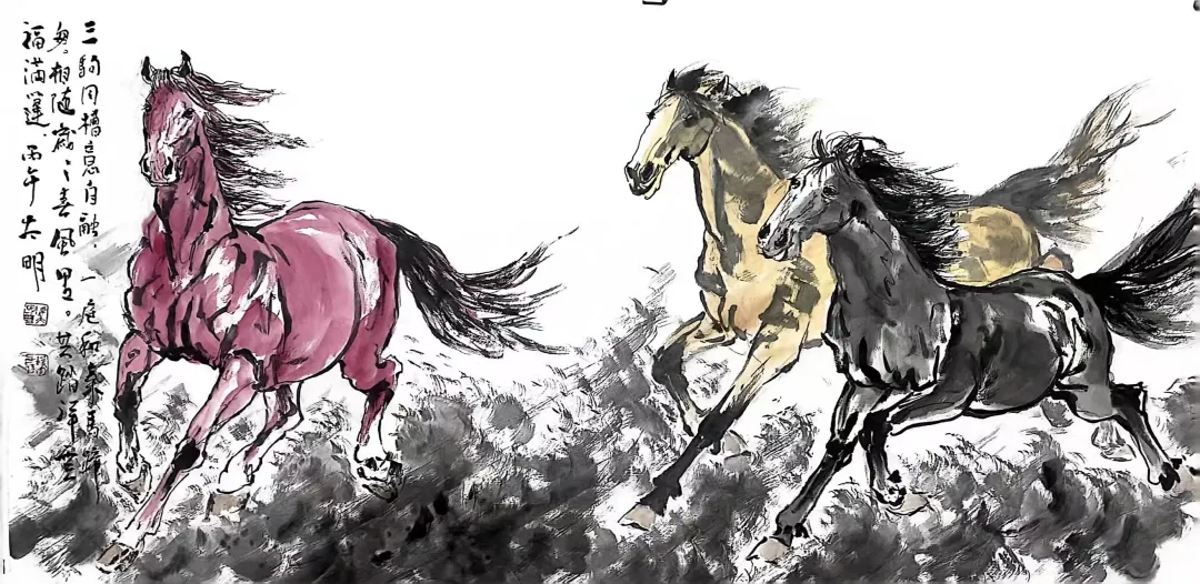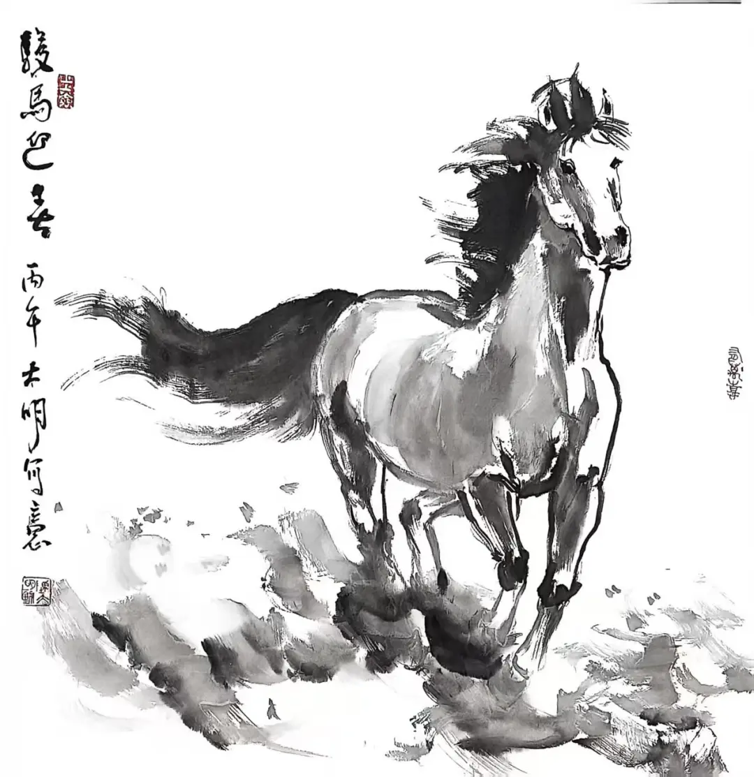 陈太明的画马作品立足中国传统写意画笔墨精神,融合现代审美意趣,以奔放的笔墨、灵动的造型和雄浑的意境,塑造出兼具精神气度与时代风骨的骏马形象。其创作既传承了徐悲鸿等前辈画马的艺术精髓,又形成了独树一帜的个人风格,通过对马的形态、神韵与精神的挖掘,寄予了对生命力量、民族精神的赞颂。
